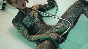Heavily tattooed petite goth model fingers gaping asshole and squirts in shower