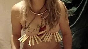 French slave housewife bound in handcuffs and chains for auto bdsm session with clamps and submission belt